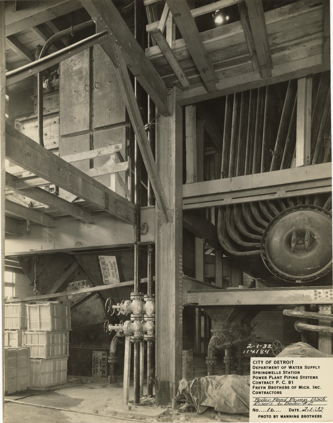 View of boiler and boiler feed pump discharge, Springwells Station treatment plant during construction, Detroit water supply system. Printed on front: "City of Detroit. Department of Water Supply. Springwells Station. Power plant piping systems. Contract P.C. 81. Freyn Brothers of Mich. Inc., contractors. Boiler feed pump disch. Risers to boiler #2. No. 16. Date: 2-1-32. Photo by Manning Brothers."