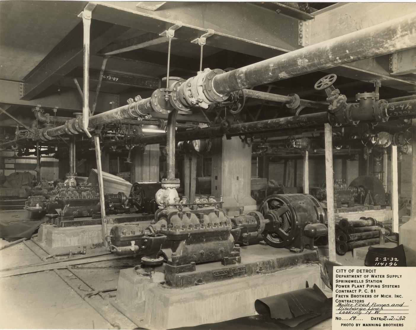 View of boiler feed pumps and discharge lines, Springwells Station treatment plant during construction, Detroit water supply system. Printed on front: "City of Detroit. Department of Water Supply. Springwells Station. Power plant piping systems. Contract P.C. 81. Freyn Brothers of Mich. Inc., contractors. Boiler feed pumps and discharge lines. Looking N.W. No. 19. Date: 2-2-32. Photo by Manning Brothers."