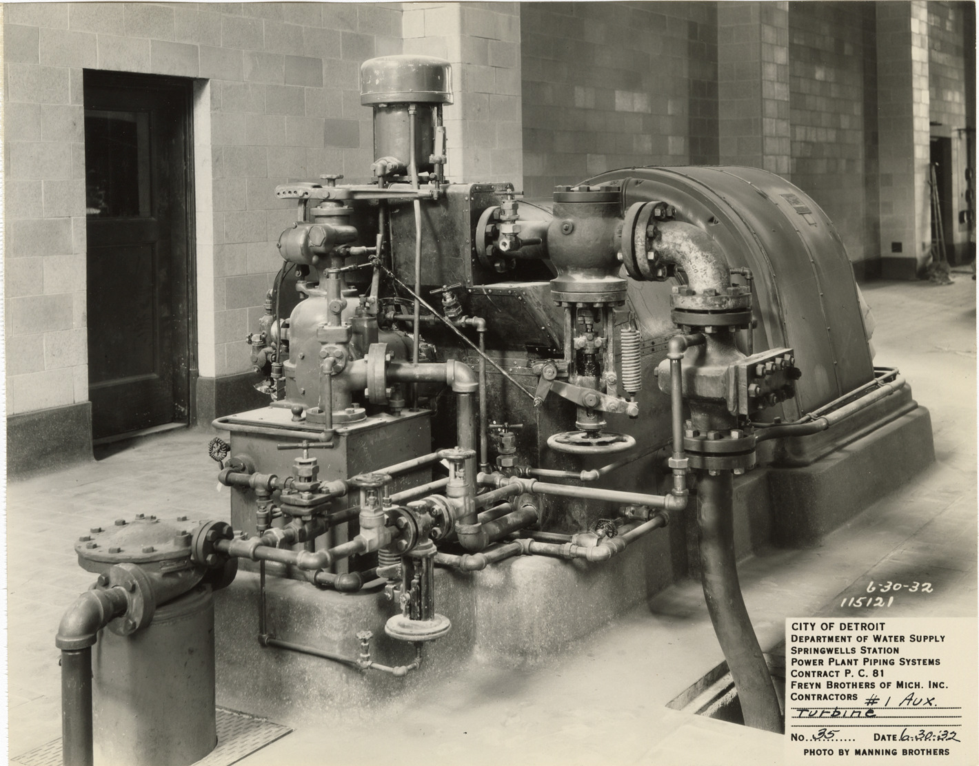 View of turbine, Springwells Station treatment plant during construction, Detroit water supply system. Printed on front: "City of Detroit. Department of Water Supply. Springwells Station. Power plant piping systems. Contract P.C. 81. Freyn Brothers of Mich. Inc., contractors. #1 aux. turbine. No. 35. Date: 6-30-32. Photo by Manning Brothers."