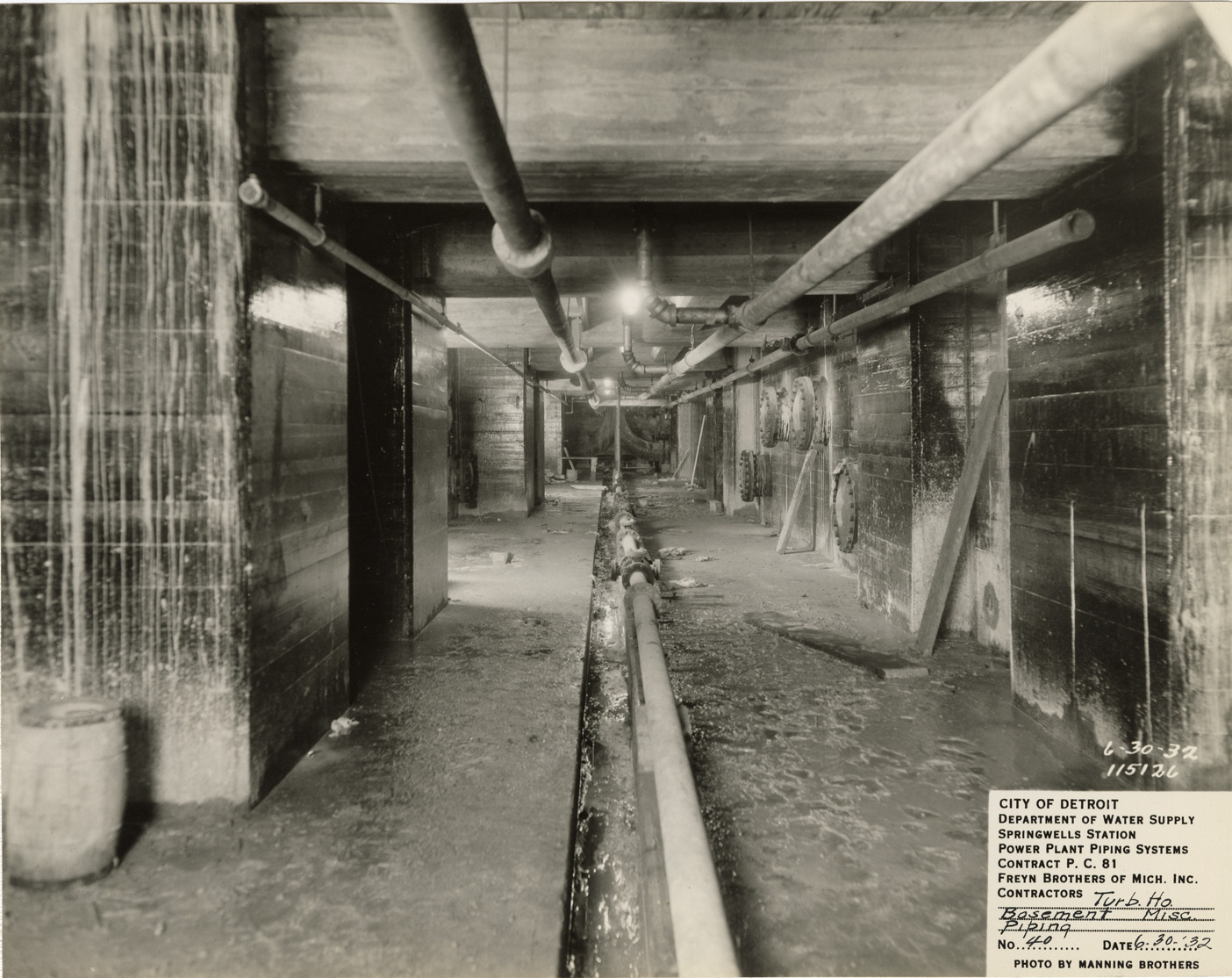 View of pipes in turbine house basement, Springwells Station treatment plant during construction, Detroit water supply system. Printed on front: "City of Detroit. Department of Water Supply. Springwells Station. Power plant piping systems. Contract P.C. 81. Freyn Brothers of Mich. Inc., contractors. Turb. ho. basement, misc. piping. No. 40. Date: 6-30-32. Photo by Manning Brothers."