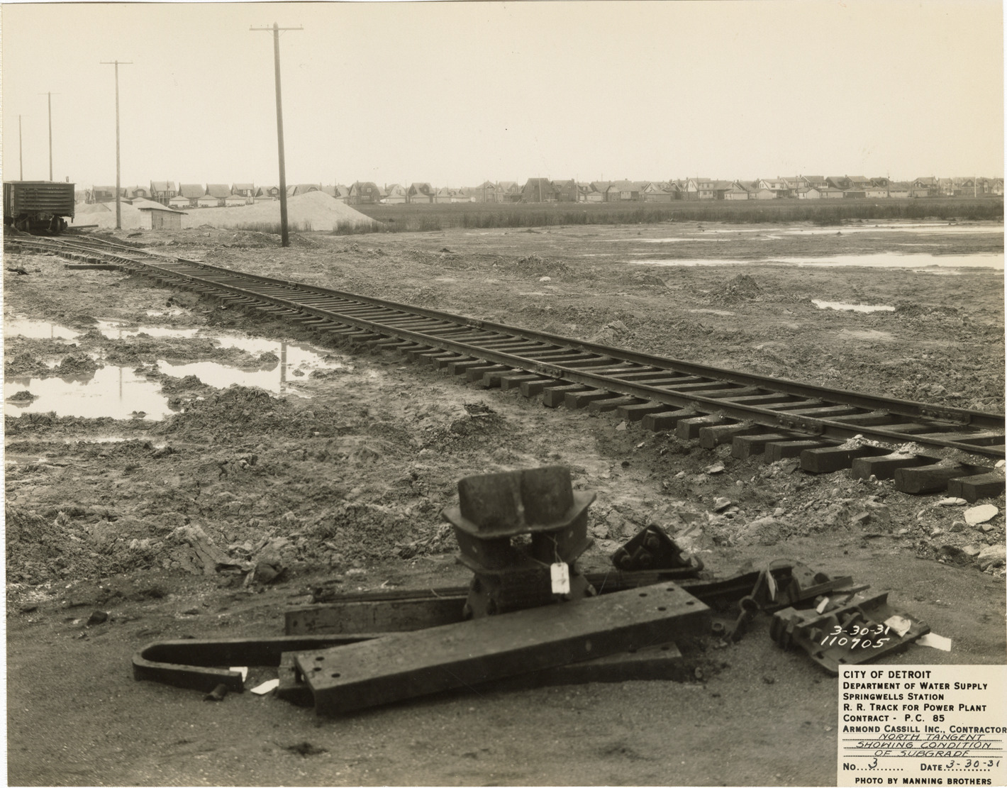 View of railroad tracks at Springwells Station treatment plant during construction, Detroit water supply system. Printed on front: "City of Detroit. Department of Water Supply. Springwells Station. R.R. track for power plant. Contract P.C. 85. Armond Cassill Inc., contractor. North tangent showing condition of subgrade. No. 3. Date: 3-30-31. Photo by Manning Brothers."