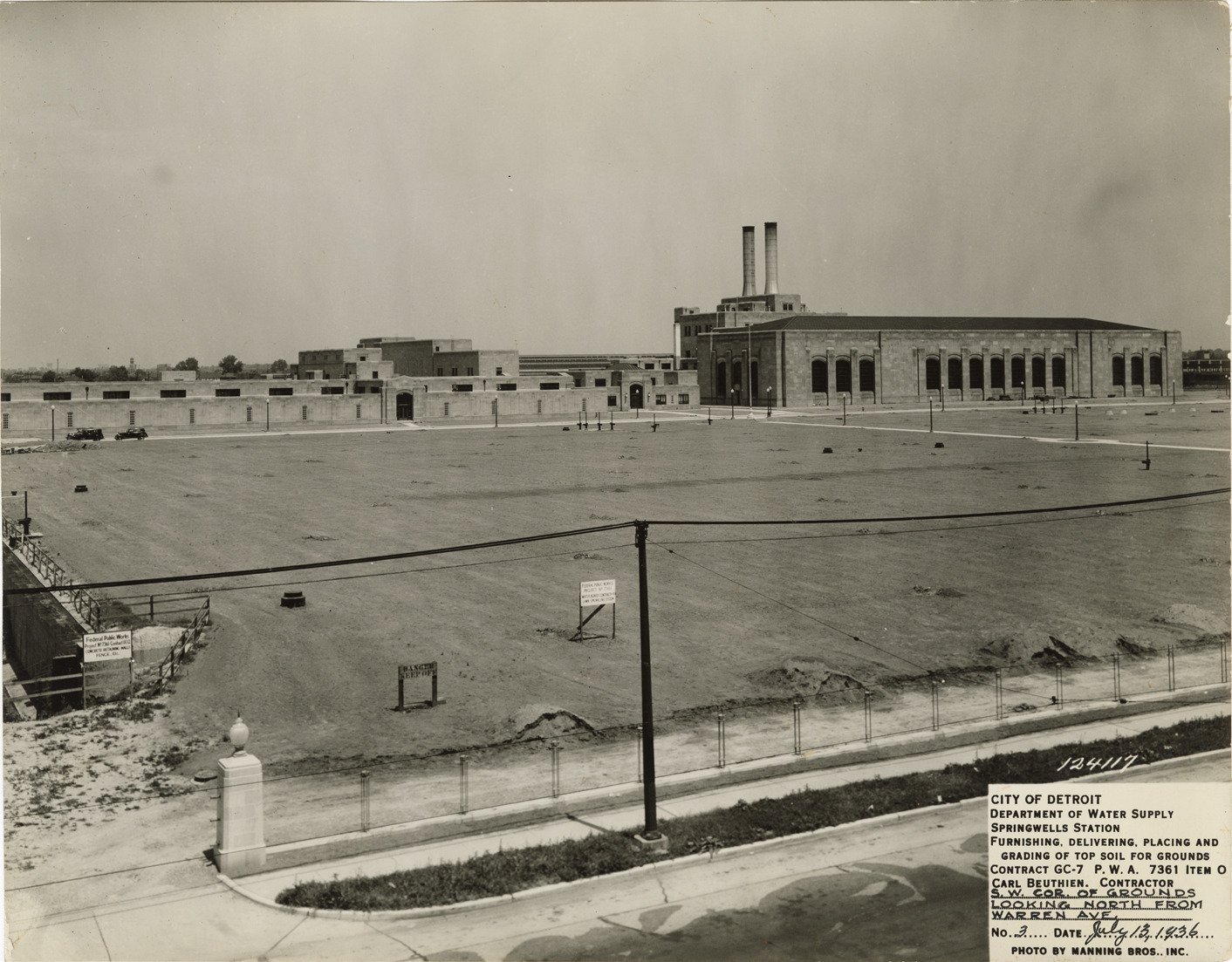 View of the grounds of the Springwells Station treatment plant during construction, Detroit water supply system. Printed on front: "City of Detroit. Department of Water Supply. Springwells Station. Furnishing, delivering, placing and grading of top soil for grounds. Contract GC-7. P.W.A. 7361 Item O. Carl Beauthien, contractor. S.W. cor. of grounds looking north from Warren Ave. No. 3. Date: July 13, 1936. Photo by Manning Brothers."