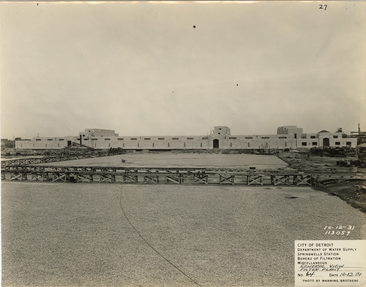 View of the Filtration Building, Springwells Station, Detroit water supply system. Printed on front: "City of Detroit. Dept. of Water Supply. Springwells Station. General view. Filter plant. No. 64. Date: 10-12-31. Photo by Manning Brothers."