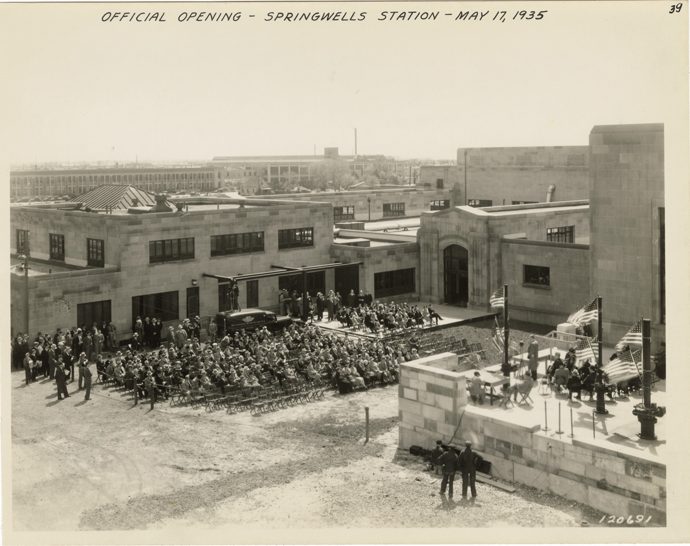 View of the official opening ceremony of the Springwells Station, Detroit water supply system. Dignitaries on terrace, which is decorated with American flags. Crowd sits in chairs in background. Handwritten on front: "Official opening, Springwells Station, May 17, 1935." Stamped on back: "Manning Bros., Inc. Commercial photographers. 333 State St., Room 505, Detroit, Michigan."