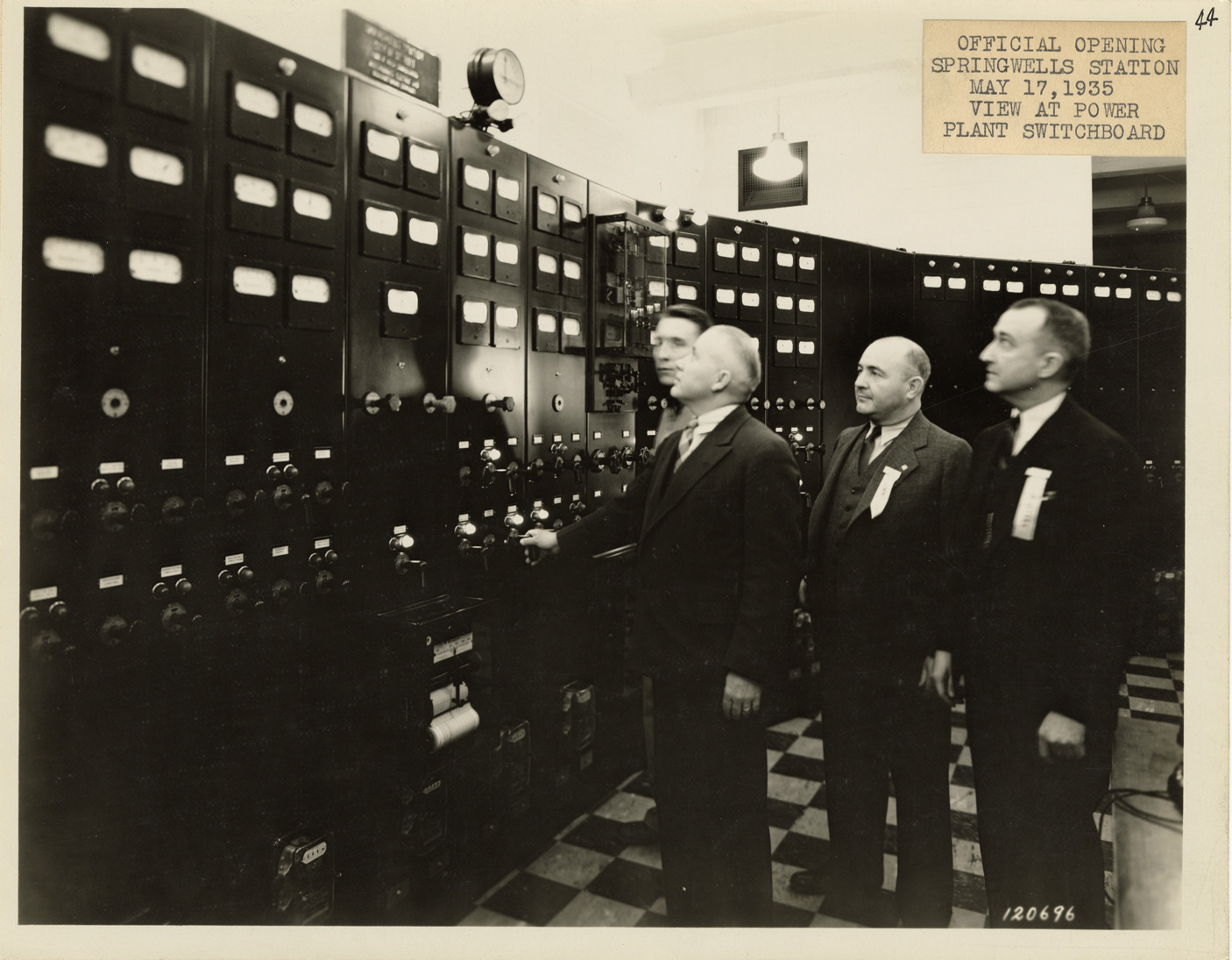 View of four men, wearing suits and "Committee" badges, posing in front of power plant switchboard at the Springwells Station, Detroit water supply system, during the official opening ceremony. Label on front: "Official opening Springwells Station, May 17, 1935. View at power plant switchboard." Stamped on back: "Manning Bros., Inc. Commercial photographers. 333 State St., Room 505, Detroit, Michigan."