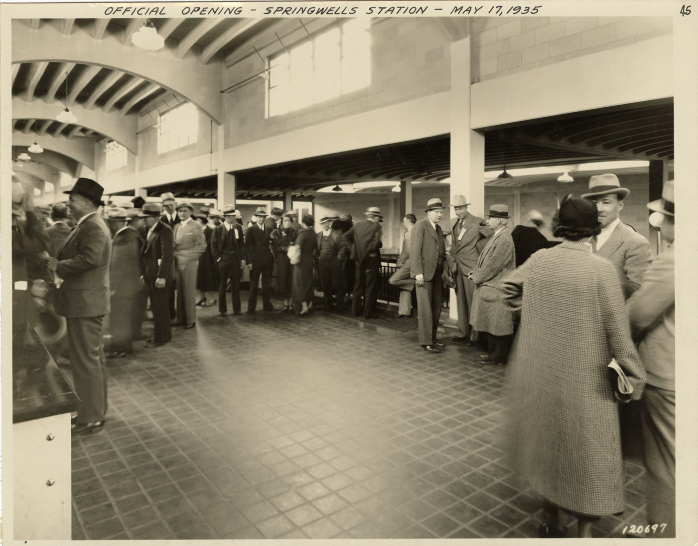 View of men and women at the official opening ceremony of the Springwells Station, Detroit water supply system. Handwritten on front: "Official opening, Springwells Station, May 17, 1935." Stamped on back: "Manning Bros., Inc. Commercial photographers. 333 State St., Room 505, Detroit, Michigan."