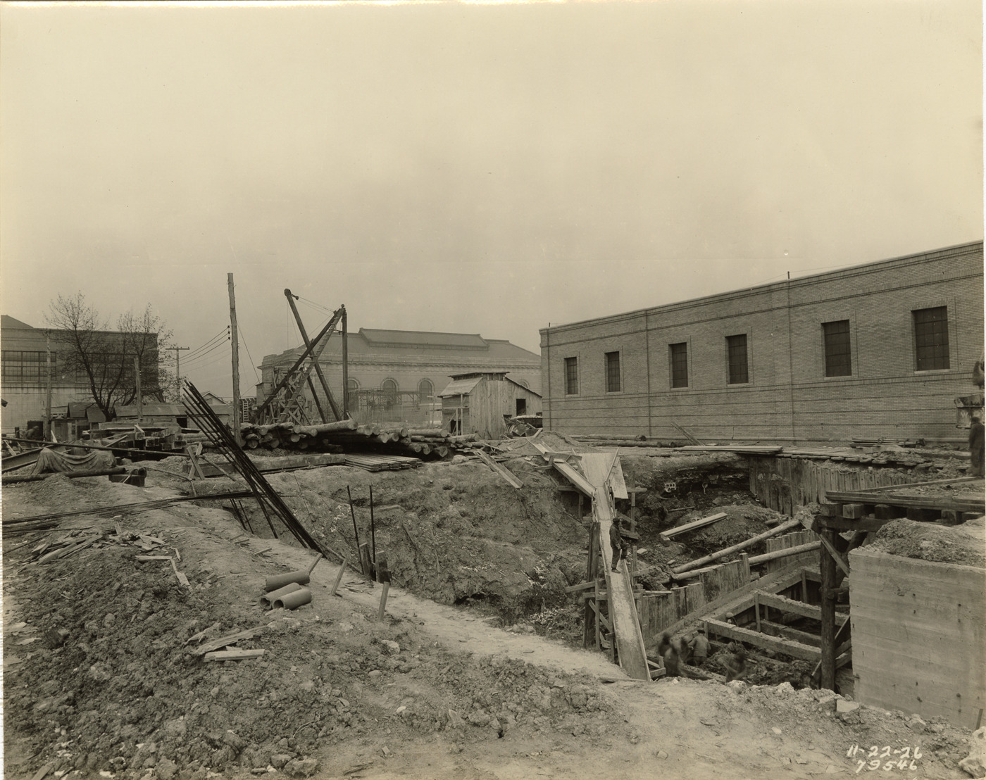 View of Weir chamber excavation at Waterworks Park, Detroit water supply system. Printed on front: "11-22-26." Stamped on back: "Manning Bros., commercial photographers. 504-505 Lincoln Building. Corner State and Park Sts., Detroit, Mich." Typed on back: "A. Phelps and Sons operations at Water Works Park. Contract FC-3. Weir chamber excavation."