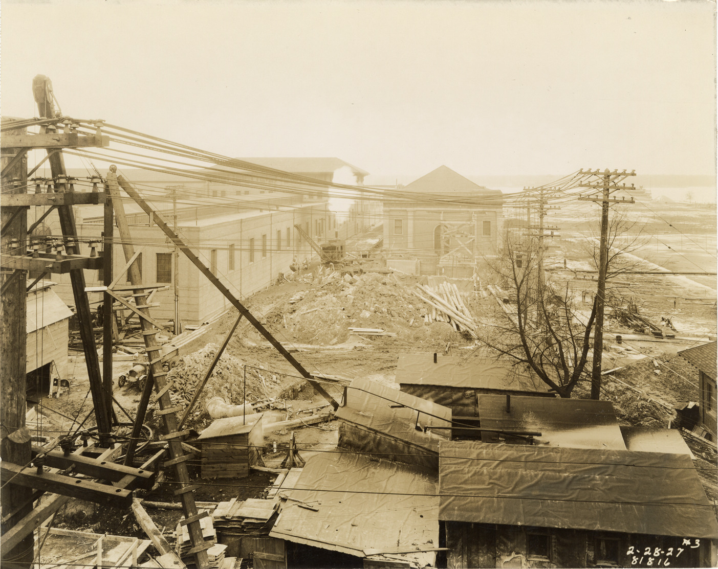 View of construction from coal storage building at Waterworks Park, Detroit water supply system. Printed on front: "2-28-27." Stamped on back: "Manning Bros., commercial photographers. 504-505 Lincoln Building. Corner State and Park Sts., Detroit, Mich." Typed on back: "A. Phelps and Sons operations at Water Works Park. Contract FC-3. View looking south from roof of coal storage building."