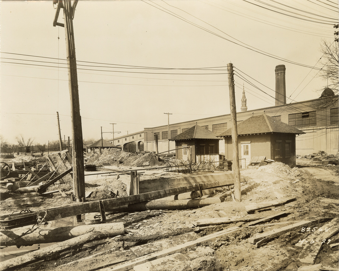 View of outlet chamber during construction at Waterworks Park, Detroit water supply system. Printed on front: "4-6-27." Stamped on back: "Manning Bros., commercial photographers. 504-505 Lincoln Building. Corner State and Park Sts., Detroit, Mich." Typed on back: "A. Phelps and Sons operations at Water Works Park. Contract FC-3. Outlet chamber almost completed."