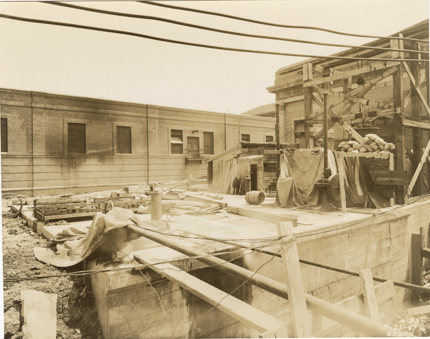 View of Weir chamber during construction at Waterworks Park, Detroit water supply system. Printed on front: "5-23-27." Stamped on back: "Manning Bros., commercial photographers. 504-505 Lincoln Building. Corner State and Park Sts., Detroit, Mich." Typed on back: "A. Phelps and Sons operations at Water Works Park. Contract FC-3. Weir chamber completed. Apparatus used by E.A. Prokop in background."
