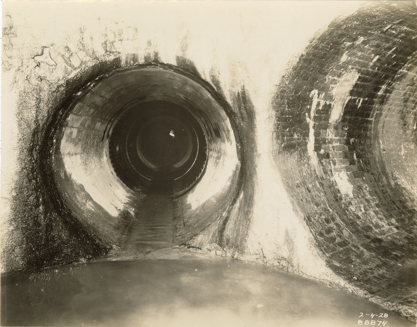 View of control chamber and tunnels during construction at Waterworks Park, Detroit water supply system. Printed on front: "2-4-28." Stamped on back: "Manning Bros., commercial photographers. 504-505 Lincoln Building. Corner State and Park Sts., Detroit, Mich." Typed on back: "Looking east from 12 foot three way junction manhole into control chamber showing new Phelps six foot tunnel in foreground; eight foot tunnel in background."