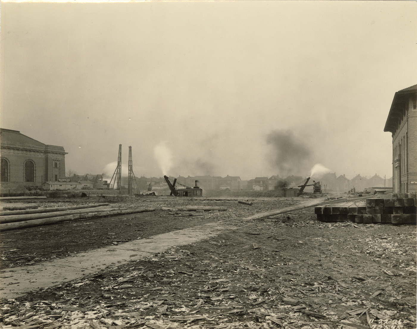 View of steam shovels on construction site during construction of reservoir no. 2 at Waterworks Park, Detroit water supply system. Houses in background. Printed on front: "11-22-26." Stamped on back: "Manning Bros., commercial photographers. 504-505 Lincoln Building. Corner State and Park Sts., Detroit, Mich." Typed on back: "Water Works Park, Reservoir no. 2. Site at the start of Whitney's operations."