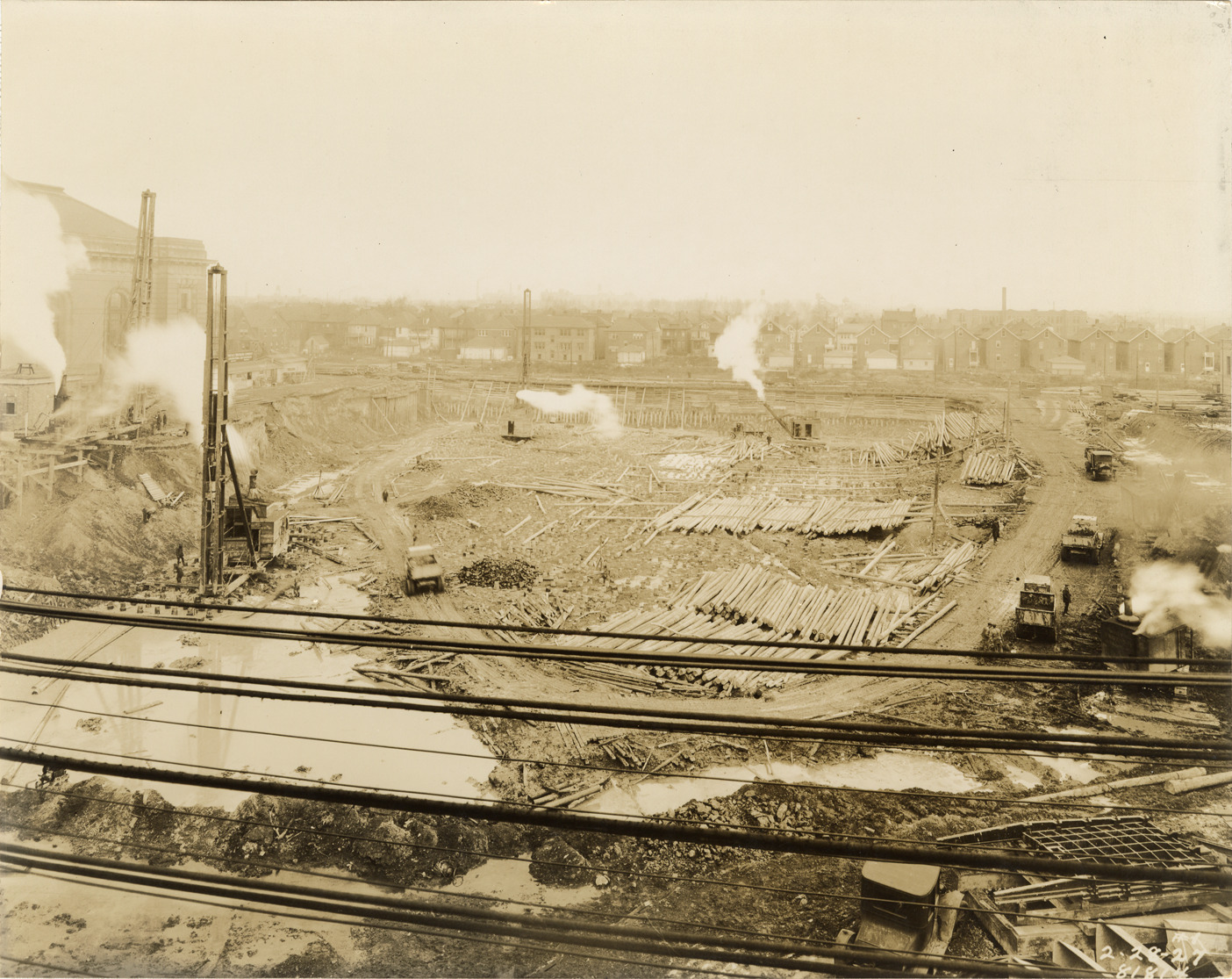 View of excavation site for reservoir no. 2 at Waterworks Park, Detroit water supply system. Pile drivers on left; piles of logs on ground. Trucks in background. Printed on front: "2-28-27." Stamped on back: "Manning Bros., commercial photographers. 504-505 Lincoln Building. Corner State and Park Sts., Detroit, Mich." Typed on back: "Water Works Park. Reservoir no. 2 looking east from roof of coal storage shed. Bank protection being done at left."