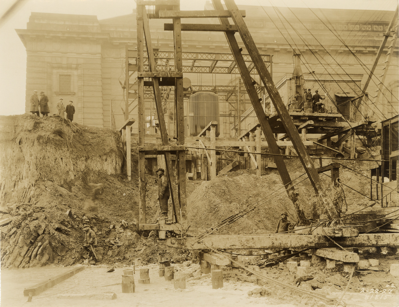 View of workers driving piles to support bank after earth slide at Waterworks Park, Detroit water supply system. Slide occurred during excavation of reservoir. Pile driver in foreground. Printed on front: "2-28-27." Stamped on back: "Manning Bros., commercial photographers. 504-505 Lincoln Building. Corner State and Park Sts., Detroit, Mich." Typed on back: "Miscellaneous. Water Works Park. Reservoir no. 2. Bank protection at north side of reservoir adjacent to transformer platform and switch house."