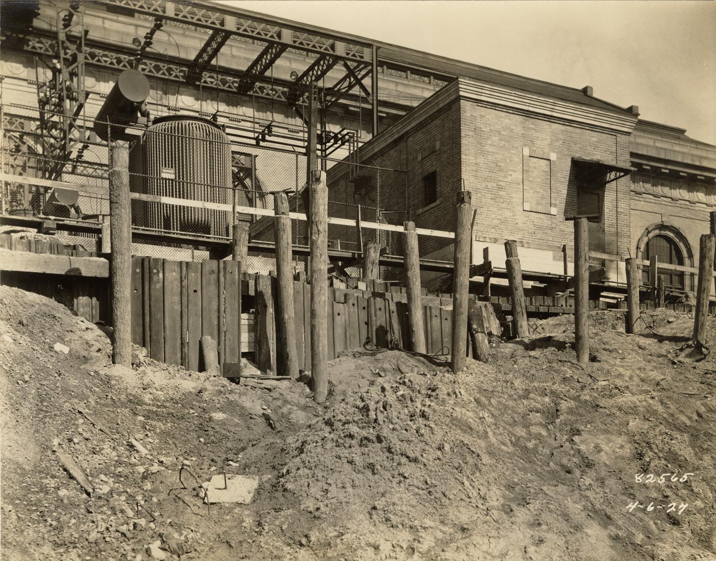 View of bank protection adjacent to transformer platform and switch house during construction of reservoir no. 2 at Waterworks Park, Detroit water supply system. Printed on front: "4-6-27." Stamped on back: "Manning Bros., commercial photographers. 504-505 Lincoln Building. Corner State and Park Sts., Detroit, Mich." Typed on back: "Miscellaneous. Water Works Park. Bank protection adjacent to transformer platform and switch house."