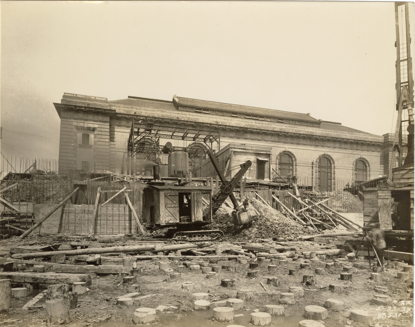 View of retaining wall adjacent to transformer platform during construction of reservoir no. 2, Waterworks Park, Detroit water supply system. Steam shovel in foreground. Printed on front: "5-23-27." Stamped on back: "Manning Bros., commercial photographers. 504-505 Lincoln Building. Corner State and Park Sts., Detroit, Mich." Typed on back: "Miscellaneous. Water Works Park. Forming wall adjacent to transformer platform."