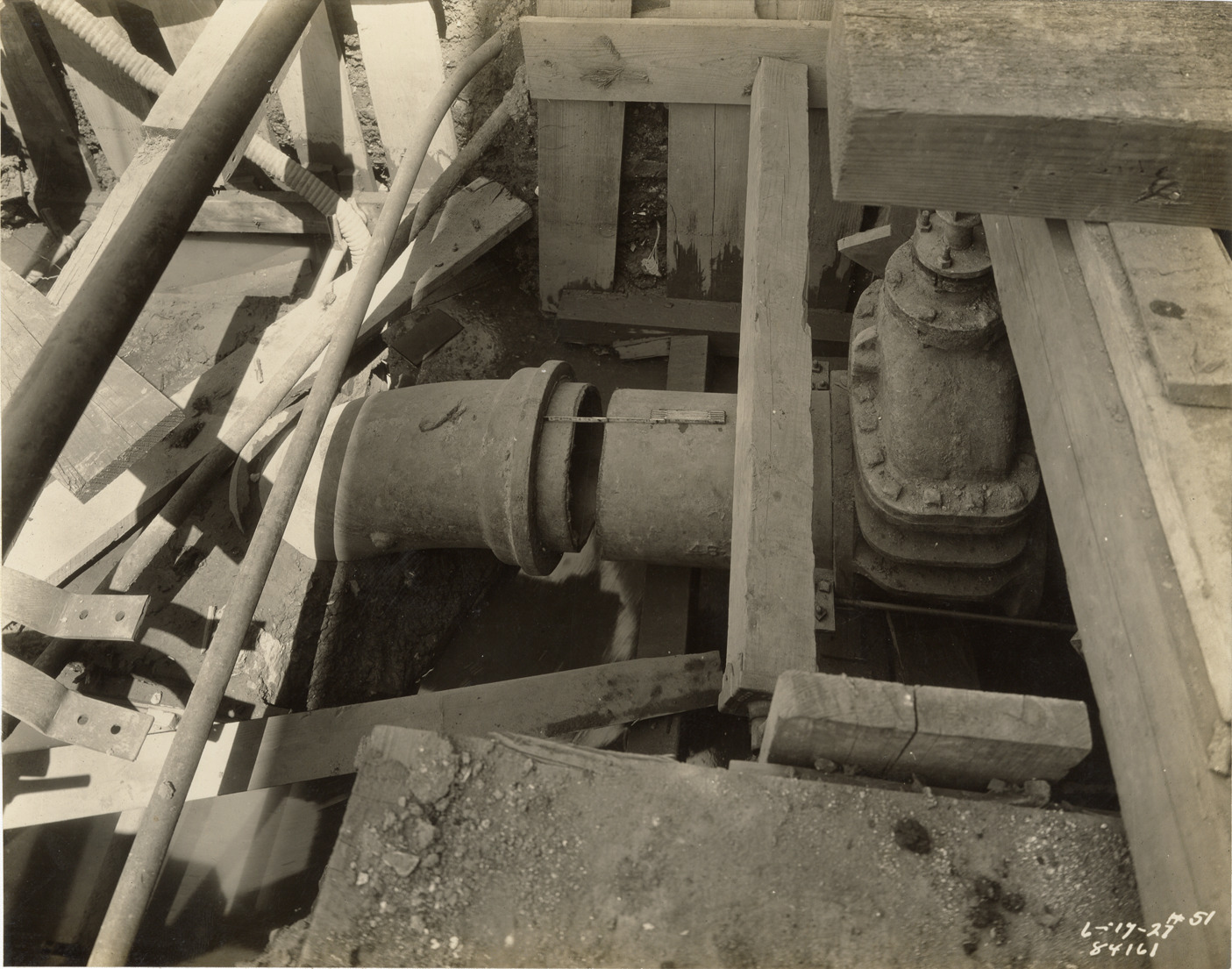 View of Water Board repairs due to earth slide during construction of reservoir no. 2, Waterworks Park, Detroit water supply system. Printed on front: "6-17-27." Stamped on back: "Manning Bros., commercial photographers. 504-505 Lincoln Building. Corner State and Park Sts., Detroit, Mich." Typed on back: "Reservoir no. 2, Water Works Park. Water Board repair work caused by excavation sliding into Whitney's excavation."