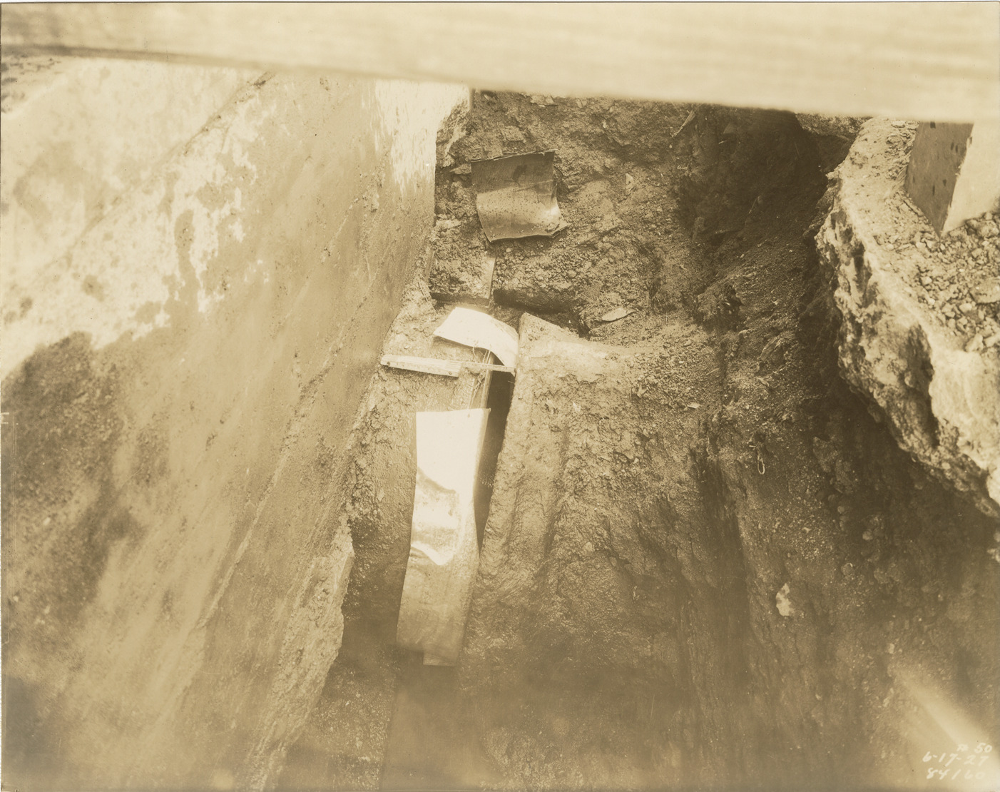 View of sewer pipe damage due to earth slide during construction of reservoir no. 2, Waterworks Park, Detroit water supply system. Printed on front: "6-17-27." Stamped on back: "Manning Bros., commercial photographers. 504-505 Lincoln Building. Corner State and Park Sts., Detroit, Mich." Typed on back: "View showing 30" cast iron wash water sewer pipe joint pulled out in front of wash water building due to earth movement toward filter water reservoir no. 2, Water Works Park. Exhibit no. 13."