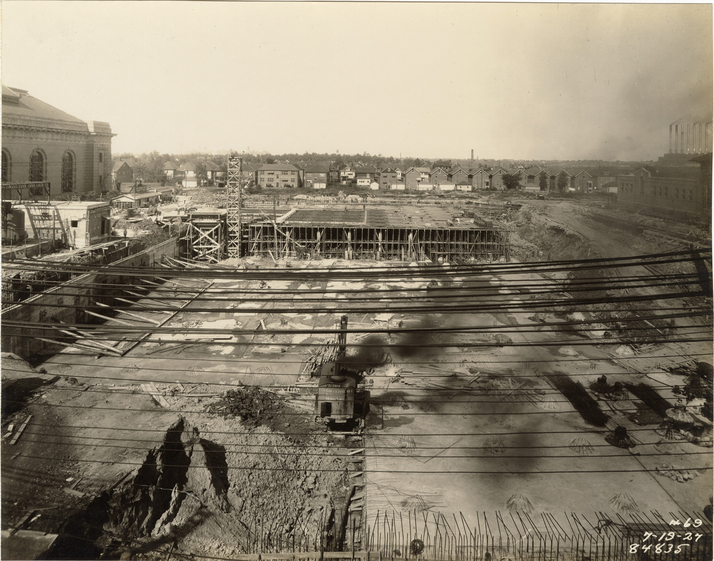 View from roof of coal storage building of reservoir no. 2 during construction, Waterworks Park, Detroit water supply system. Steam shovel in foreground. Printed on front: "7-19-27." Stamped on back: "Manning Bros., commercial photographers. 504-505 Lincoln Building. Corner State and Park Sts., Detroit, Mich." Typed on back: "Reservoir no. 2, Water Works Park. General view looking east from roof of coal storage building."