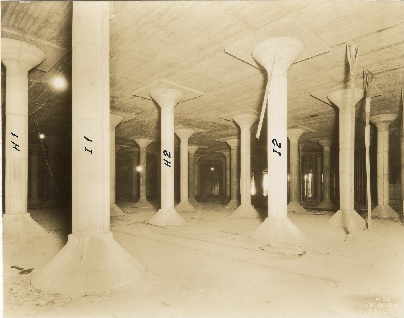 View of columns in reservoir no. 2 during construction, Waterworks Park, Detroit water supply system. Printed on front: "10-11-27." Handwritten on front: "H1, I1, H2, I2." Stamped on back: "Manning Bros., commercial photographers. 504-505 Lincoln Building. Corner State and Park Sts., Detroit, Mich." Typed on back: "Reservoir no. 2. Looking northeast from the approximate center of the west wall."