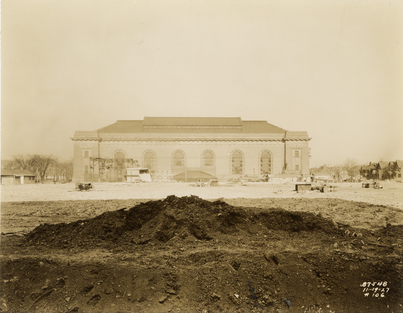 View reservoir no. 2 during construction, Waterworks Park, Detroit water supply system. Printed on front: "11-19-27." Typed on back: "Reservoir no. 2. Water Works Park. View looking north from filter plant showing completed reservoir. Water Board forces working at southeast corner. Note: pictures no.'s 106, 107 and 108 make up a panorama."