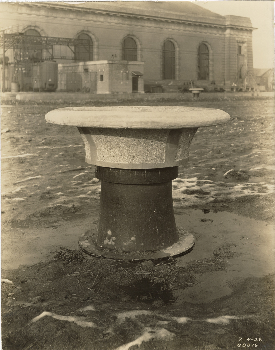 View of a concrete flower pot and cast iron ventilator above reservoir no. 2 during construction, Waterworks Park, Detroit water supply system. Printed on front: "2-4-28." Stamped on back: "Manning Bros., commercial photographers. 504-505 Lincoln Building. Corner State and Park Sts., Detroit, Mich." Typed on back: "Concrete flower pot and cast iron ventilator on clear water reservoirs."
