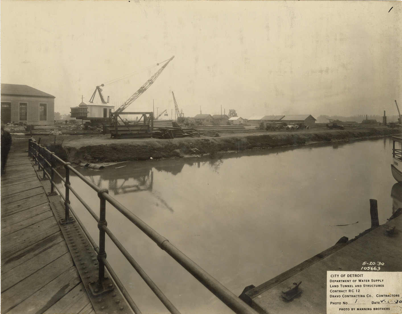 View of site for screen chamber and construction shaft for tunnel, Waterworks Park, Detroit water supply system. Printed on front: "City of Detroit. Department of Water Supply. Land tunnel and structures. Contract RC 12. Dravo Contracting Co., contractors. Photo no. 1. Date: 5-20-30. Photo by Manning Brothers." Typed on back: "View of site for screen chamber and construction shaft for 15'-6" tunnel. Looking eastward across coal canal."