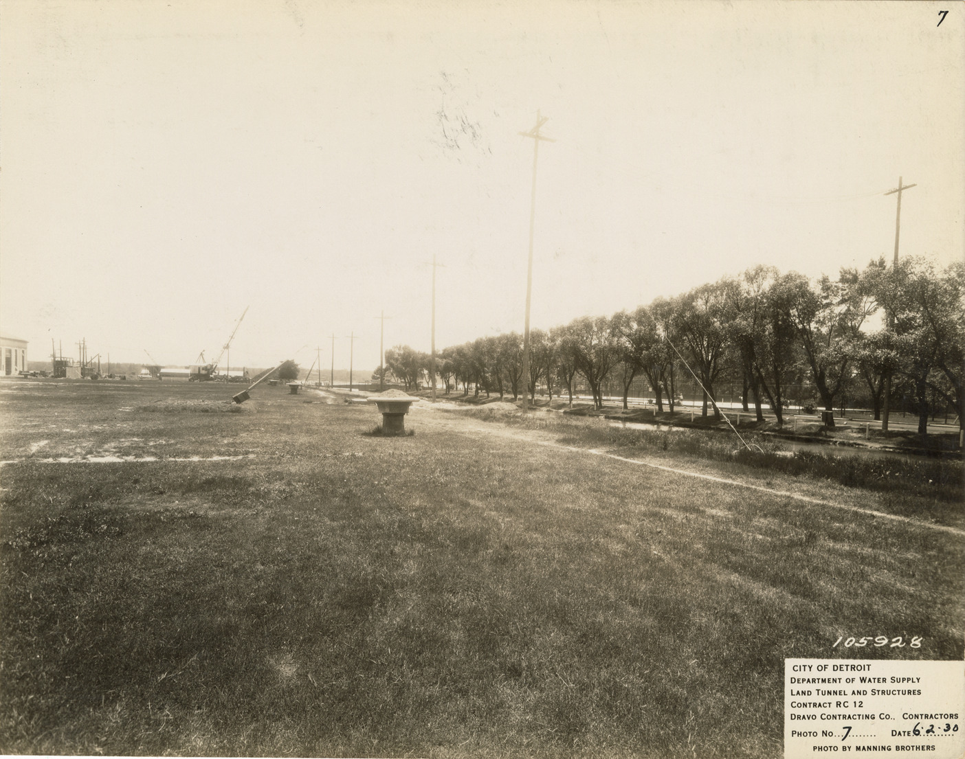 View of power line for tunnel along east side of coal canal, Waterworks Park, Detroit water supply system. Printed on front: "City of Detroit. Department of Water Supply. Land tunnel and structures. Contract RC 12. Dravo Contracting Co., contractors. Photo no. 7. Date: 6-2-30. Photo by Manning Brothers." Typed on back: "View along east side of coal canal showing power line for supplying electric current to 14 ft. tunnel."