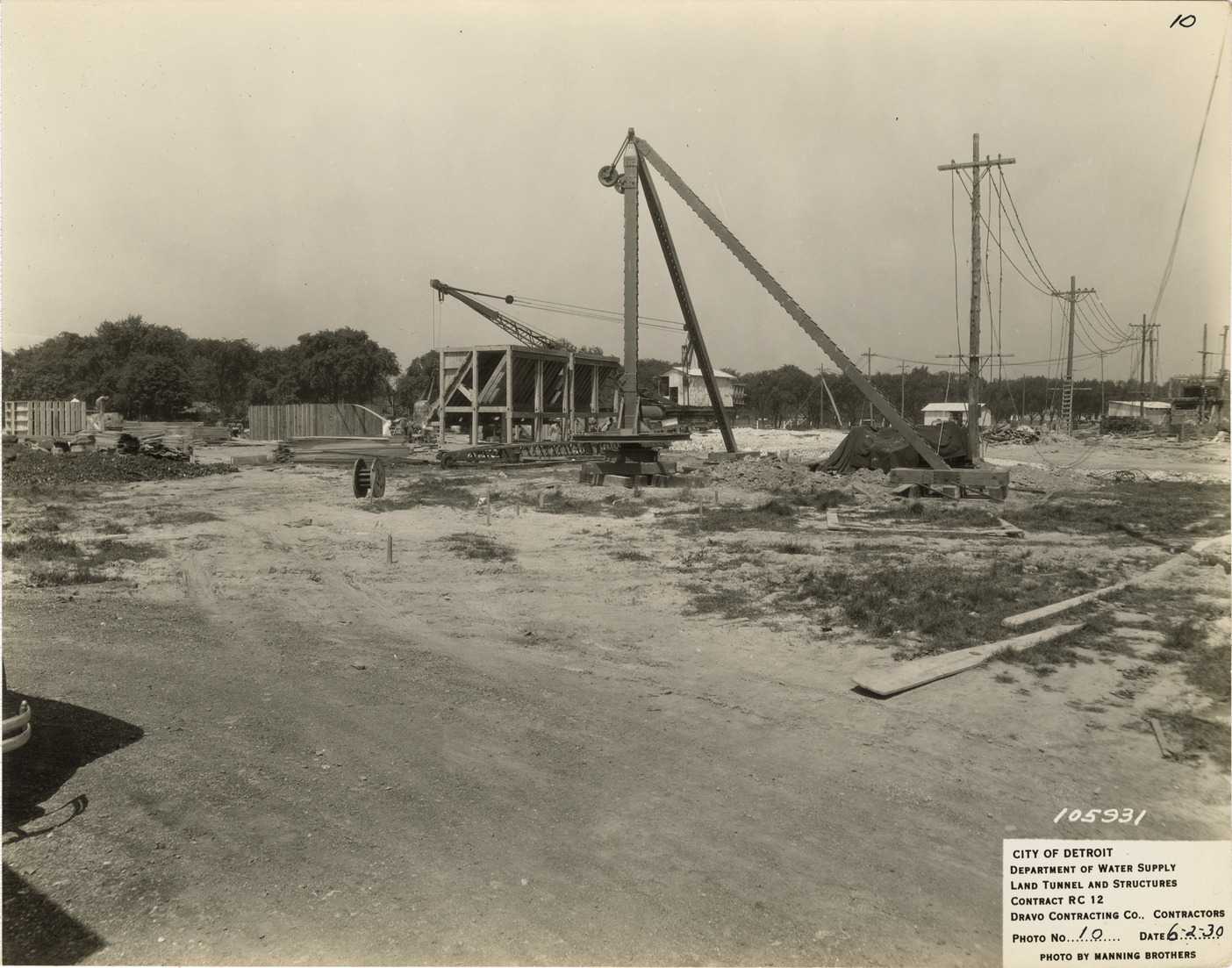View of plant site with stiff-leg derrick in foreground, Waterworks Park, Detroit water supply system. Printed on front: "City of Detroit. Department of Water Supply. Land tunnel and structures. Contract RC 12. Dravo Contracting Co., contractors. Photo no. 10. Date: 6-2-30. Photo by Manning Brothers." Typed on back: "General view of plant and plant site on east side of canal. Stiff-leg derrick for constructing 15'-6" tunnel in middle ground."
