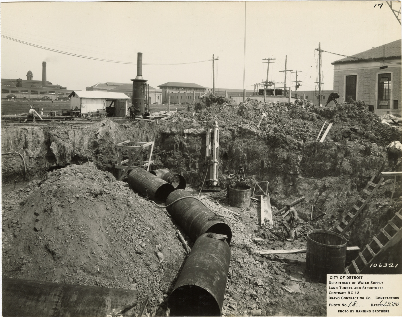 View of screen chamber during construction, Waterworks Park, Detroit water supply system. Printed on front: "City of Detroit. Department of Water Supply. Land tunnel and structures. Contract RC 12. Dravo Contracting Co., contractors. Photo no. 18. Date: 6-23-30. Photo by Manning Brothers." Typed on back: "Screen chamber. Sinking 4 1/2 ft. diameter shafts for landing piers for caisson. Steel shells are driven down with steam pile driver as the excavating proceeds. Shells are removed after concrete piers are placed."