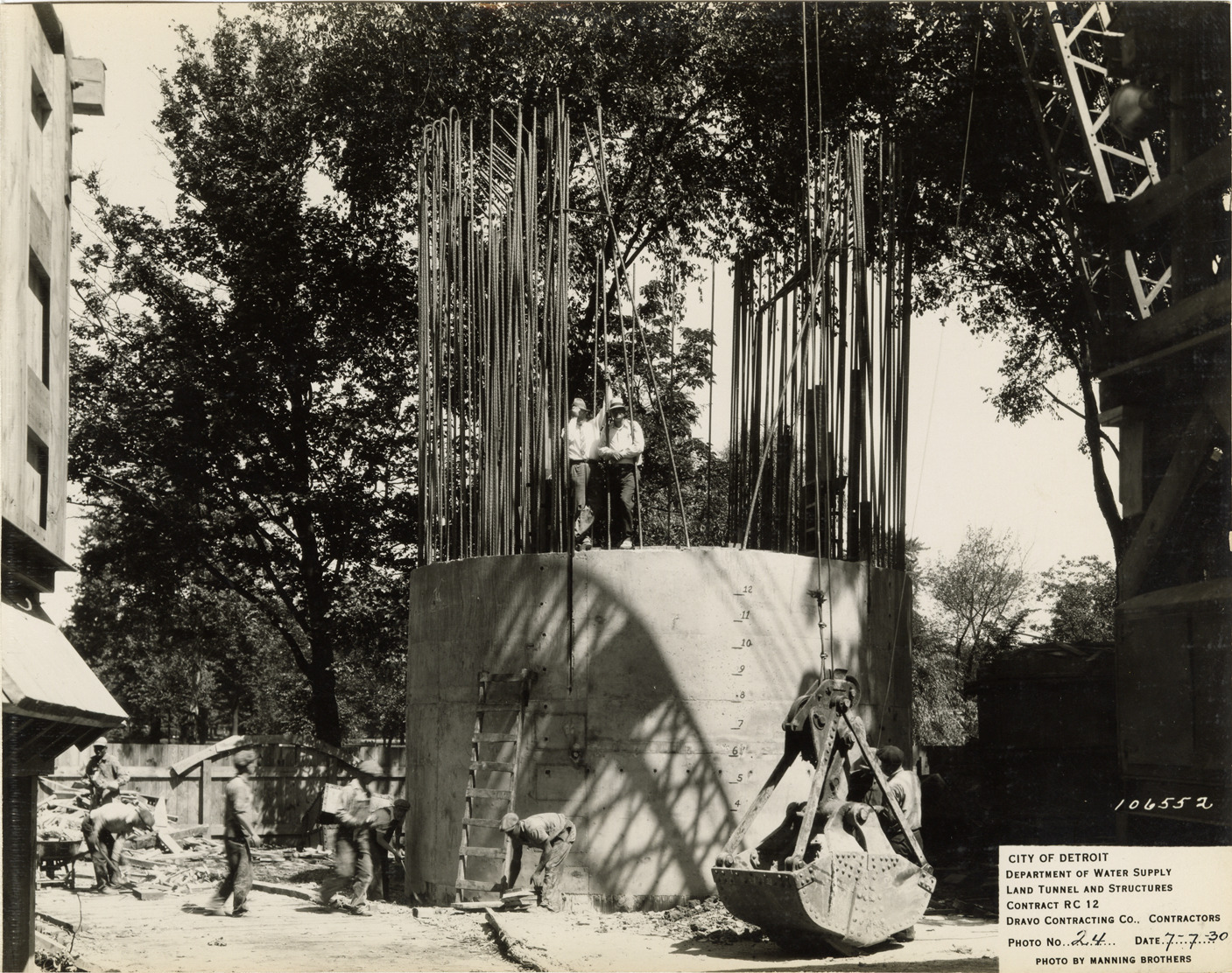 View of workers constructing north stop log shaft, Waterworks Park, Detroit water supply system. Printed on front: "City of Detroit. Department of Water Supply. Land tunnel and structures. Contract RC 12. Dravo Contracting Co., contractors. Photo no. 24. Date: 7-7-30. Photo by Manning Brothers." Typed on back: "North stop log shaft. Forms removed from first lift of concrete shell."