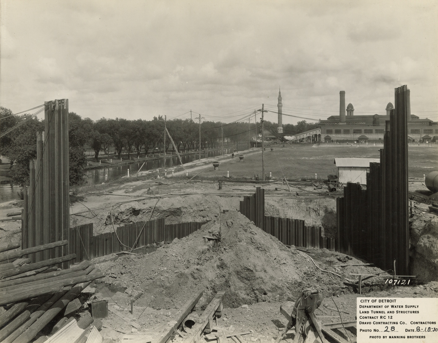 View of steel sheet piling around excavation for screen chamber, Waterworks Park, Detroit water supply system. Printed on front: "City of Detroit. Department of Water Supply. Land tunnel and structures. Contract RC 12. Dravo Contracting Co., contractors. Photo no. 28. Date: 8-18-30. Photo by Manning Brothers." Typed on back: "Driving steel sheet piling around excavation for screen chamber."
