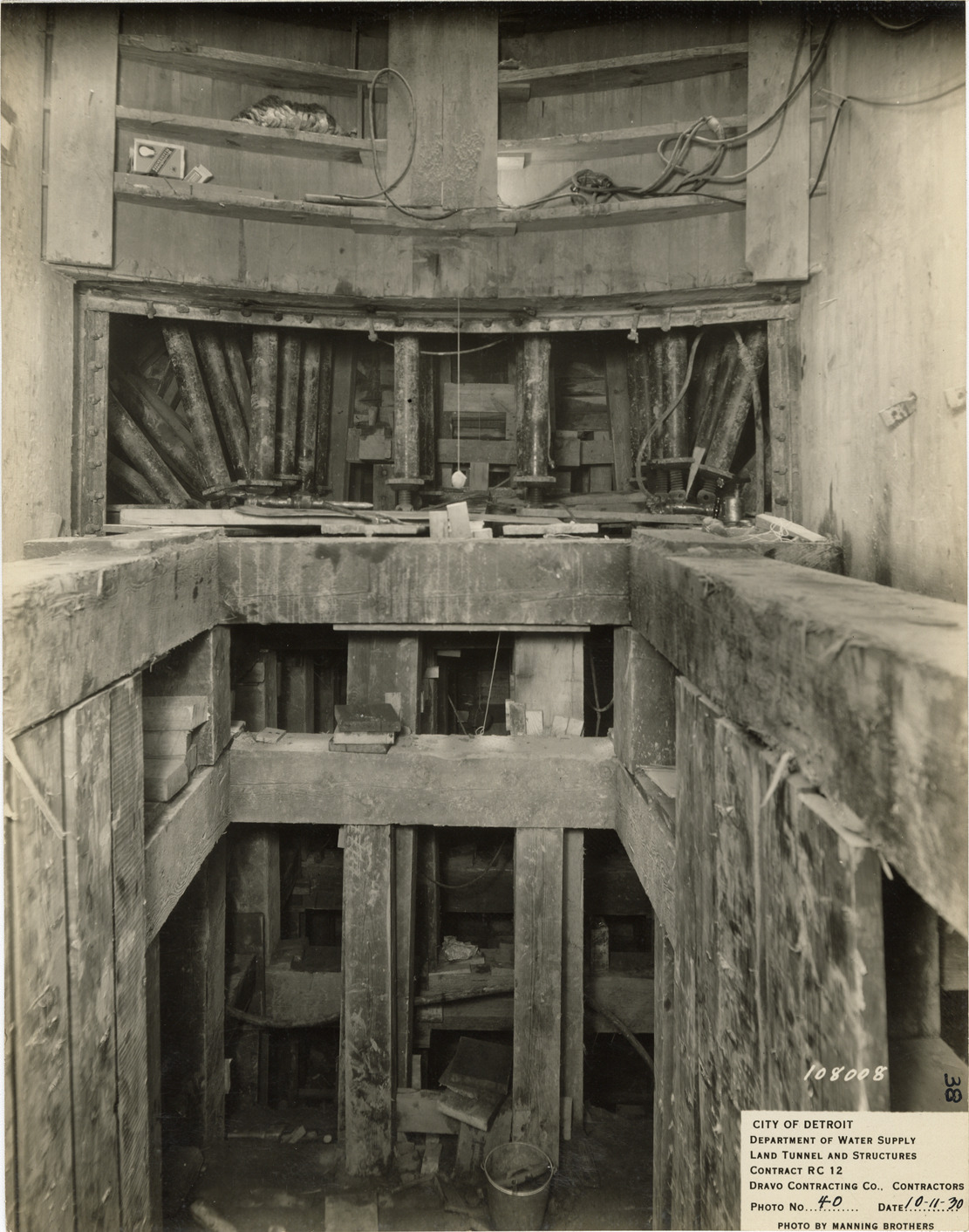 View of south stop log shaft, Waterworks Park, Detroit water supply system. Printed on front: "City of Detroit. Department of Water Supply. Land tunnel and structures. Contract RC 12. Dravo Contracting Co., contractors. Photo no. 40. Date: 10-11-30. Photo by Manning Brothers." Typed on back: "South stop-log shaft; view showing brace pipes and needle beams and timbering supporting first half of north transition."