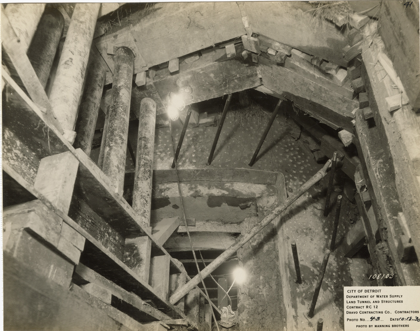 View of north log stop shaft, Waterworks Park, Detroit water supply system. Printed on front: "City of Detroit. Department of Water Supply. Land tunnel and structures. Contract RC 12. Dravo Contracting Co., contractors. Photo no. 43. Date: 10-18-30. Photo by Manning Brothers." Typed on back: "North stop-log shaft; timbering and bracing in upper quarter of first half of south transition; note copper water-stop around opening in shaft wall."