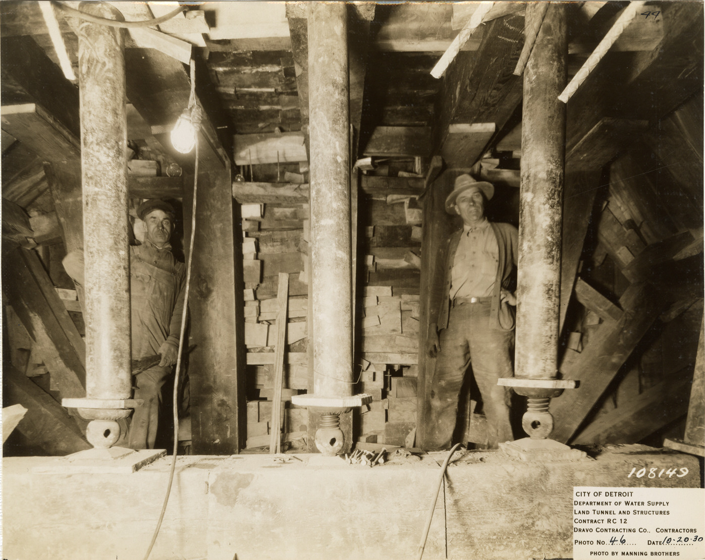 View of workers posing among timbering for north transition of south stop log shaft, Waterworks Park, Detroit water supply system. Printed on front: "City of Detroit. Department of Water Supply. Land tunnel and structures. Contract RC 12. Dravo Contracting Co., contractors. Photo no. 46. Date: 10-20-30. Photo by Manning Brothers." Typed on back: "Timbering for north transition of south stop-log shaft."