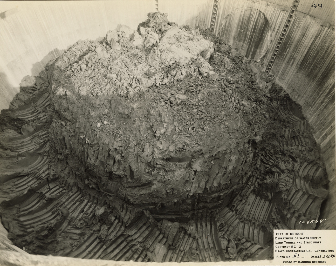 View of screen chamber caisson during construction, Waterworks Park, Detroit water supply system. Printed on front: "City of Detroit. Department of Water Supply. Land tunnel and structures. Contract RC 12. Dravo Contracting Co., contractors. Photo no. 51. Date: 11-12-30. Photo by Manning Brothers." Typed on back: "Screen chamber caisson; sinking caisson by excavating annular trench and leaving a core to prevent heaving of bottom and rapid sinking."