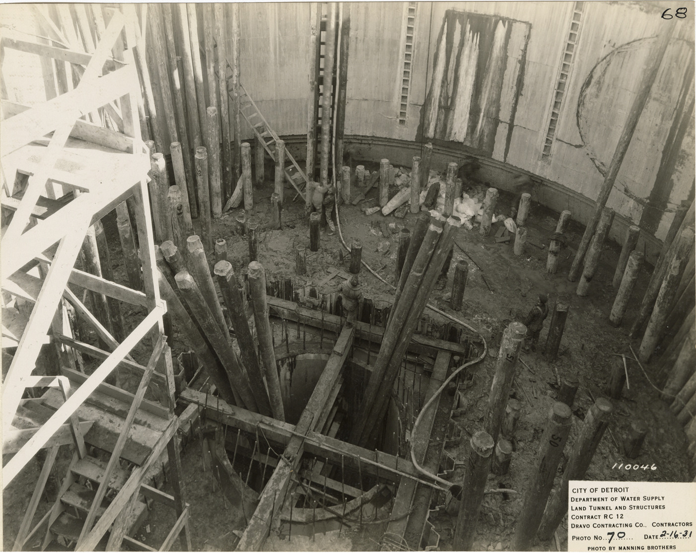 View of foundation piles in screen chamber, Waterworks Park, Detroit water supply system. Printed on front: "City of Detroit. Department of Water Supply. Land tunnel and structures. Contract RC 12. Dravo Contracting Co., contractors. Photo no. 70. Date: 2-16-31. Photo by Manning Brothers." Typed on back: "Screen chamber: driving foundation piles."