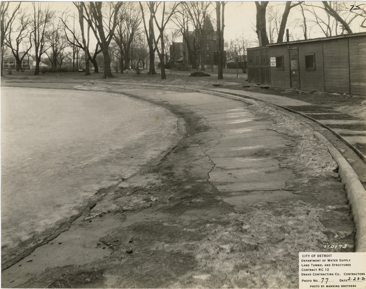View of wading pool, Waterworks Park, Detroit water supply system. Printed on front: "City of Detroit. Department of Water Supply. Land tunnel and structures. Contract RC 12. Dravo Contracting Co., contractors. Photo no. 77. Date: 2-23-31. Photo by Manning Brothers." Typed on back: "Water Works Park wading pool. Photo of concrete lining over line of 14 ft. tunnel showing existing cracks."