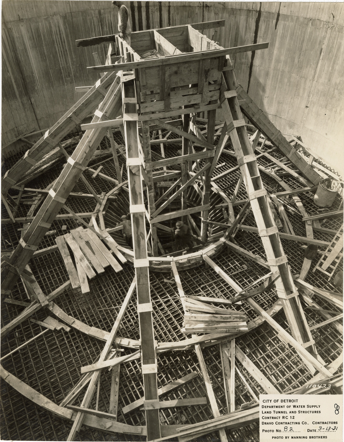 Workers constructing screen chamber, Waterworks Park, Detroit water supply system