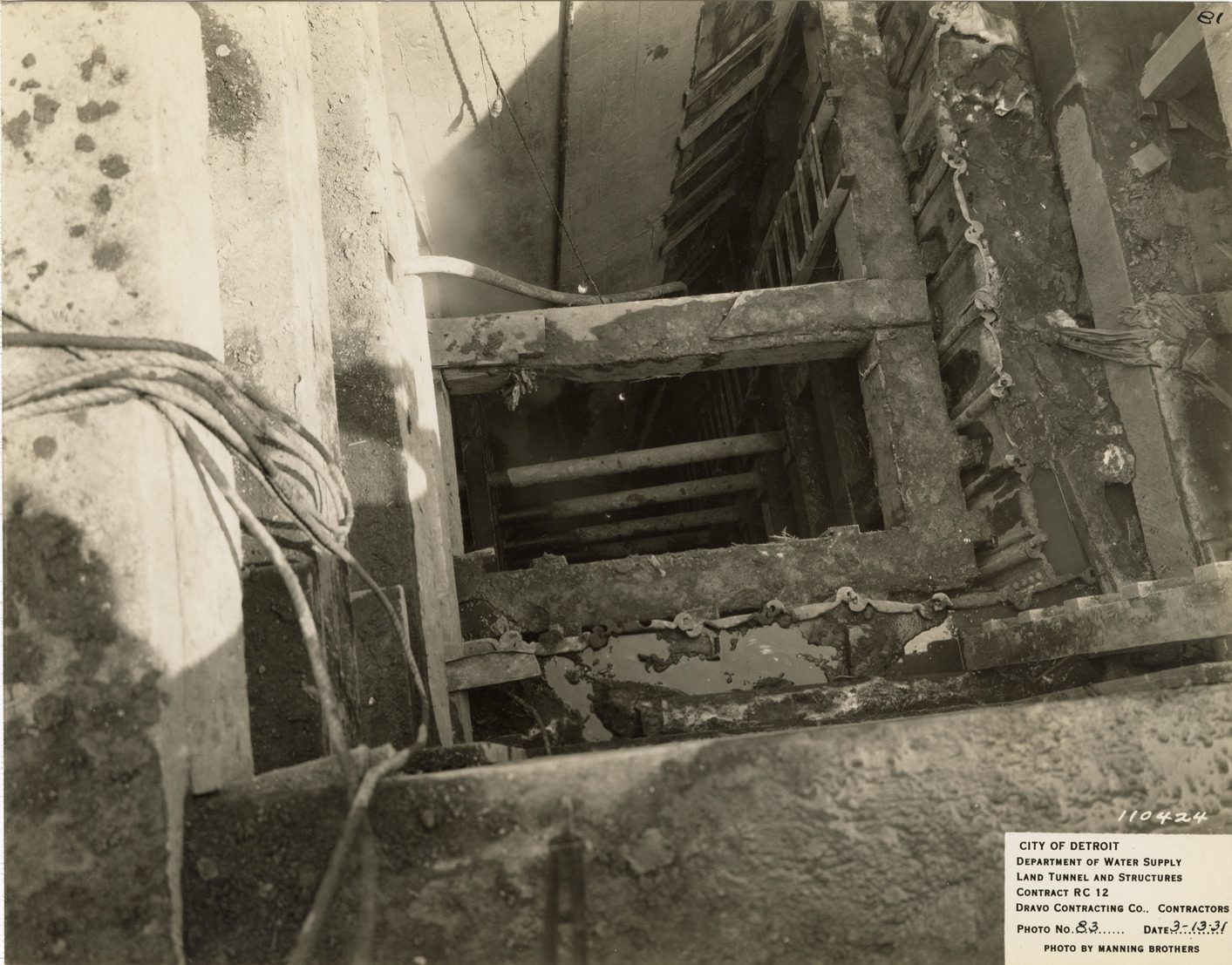 View of south stop log shaft, Waterworks Park, Detroit water supply system. Printed on front: "City of Detroit. Department of Water Supply. Land tunnel and structures. Contract RC 12. Dravo Contracting Co., contractors. Photo no. 83. Date: 3-13-31. Photo by Manning Brothers." Typed on back: "South stop-log shaft. 14 ft. tunnel. View of steel sheet piling and bracing of excavation for stop-log well for 12 ft. tunnel stub."