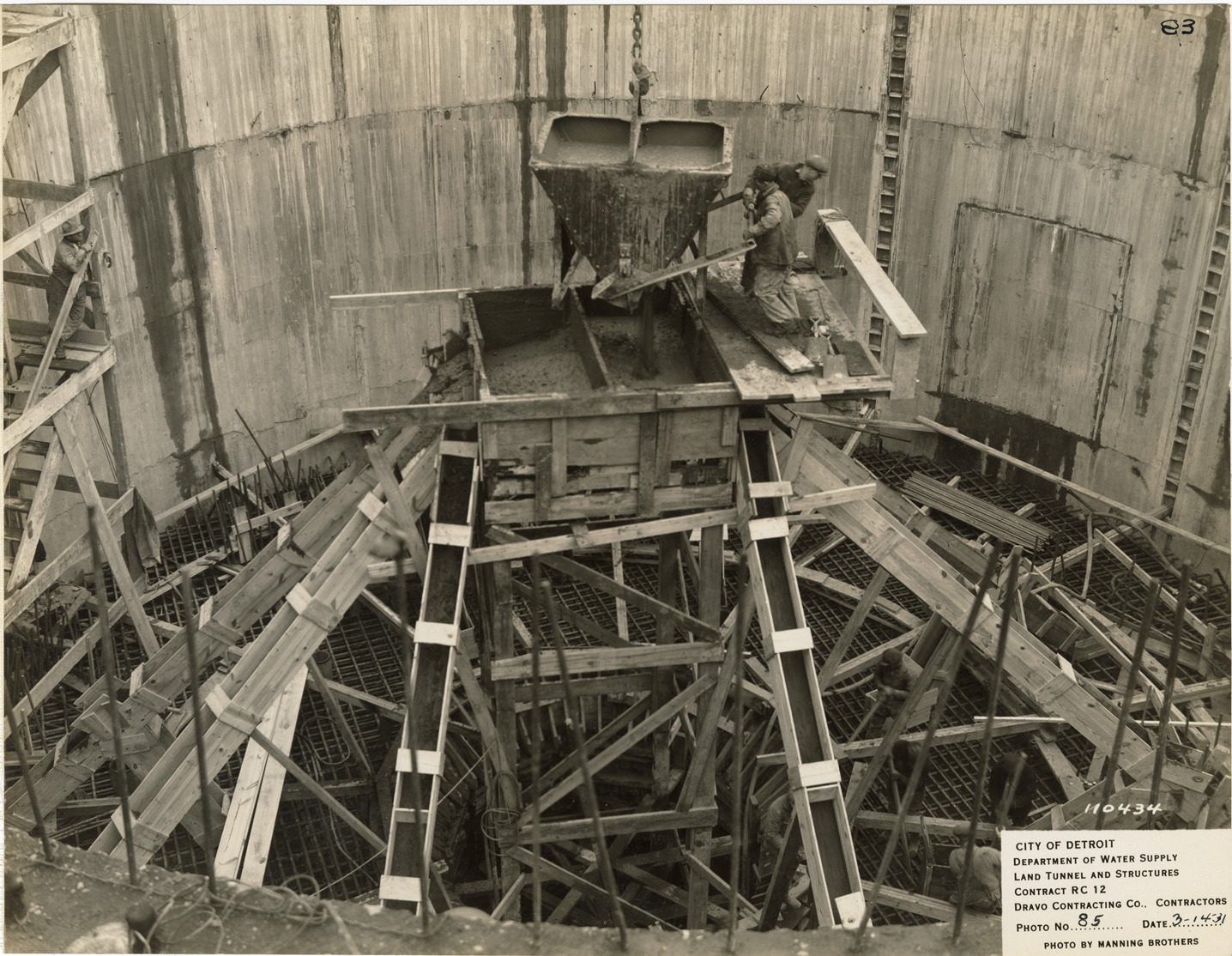 Workers pouring concrete for screen chamber foundation slab, Waterworks Park, Detroit water supply system