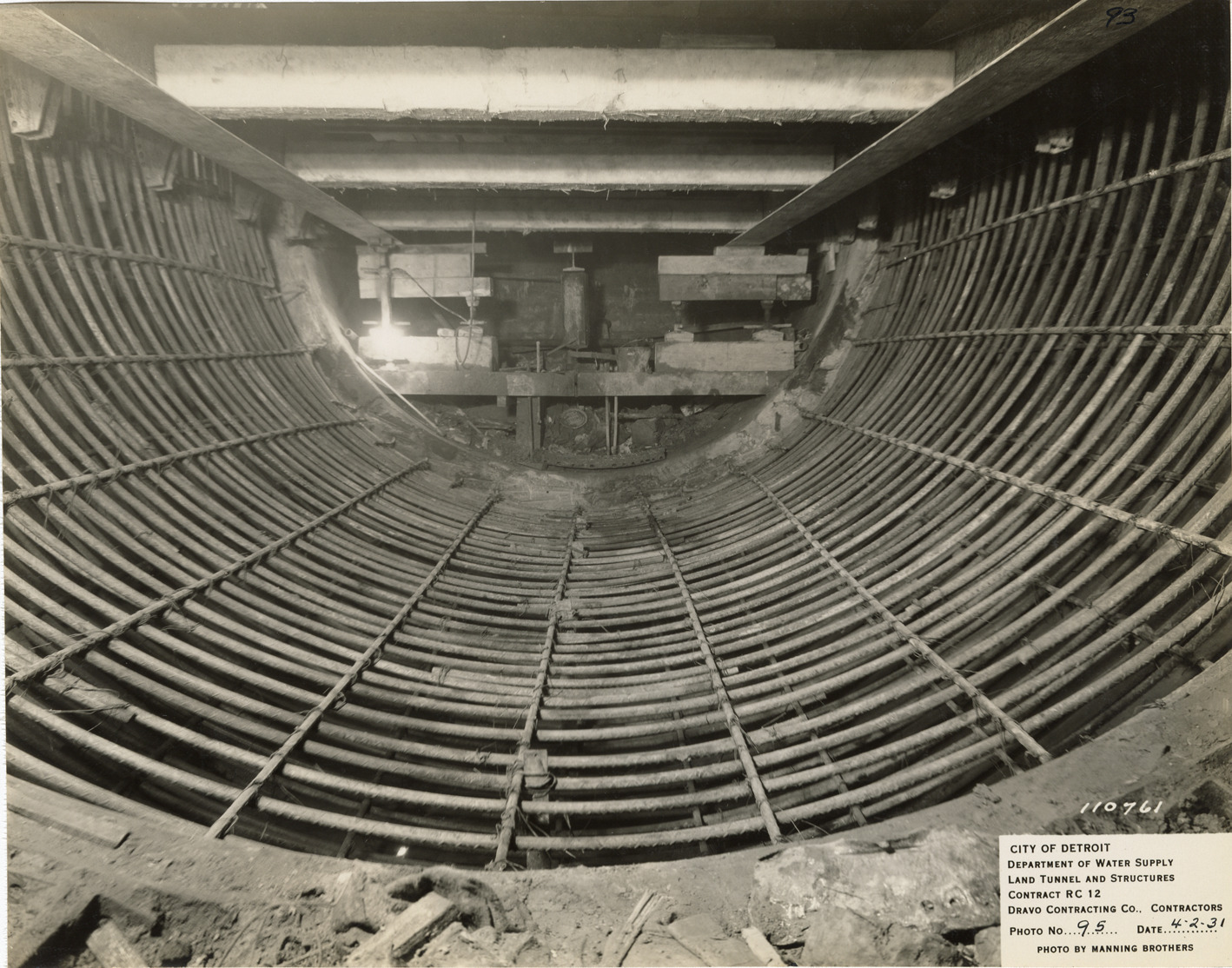 View of south heading of tunnel during construction, Waterworks Park, Detroit water supply system. Printed on front: "City of Detroit. Department of Water Supply. Land tunnel and structures. Contract RC 12. Dravo Contracting Co., contractors. Photo no. 95. Date: 4-2-31. Photo by Manning Brothers." Typed on back: "14 ft. tunnel south heading view of reinforcing steel above springing line in the last 18 ft. of tunnel at screen chamber."