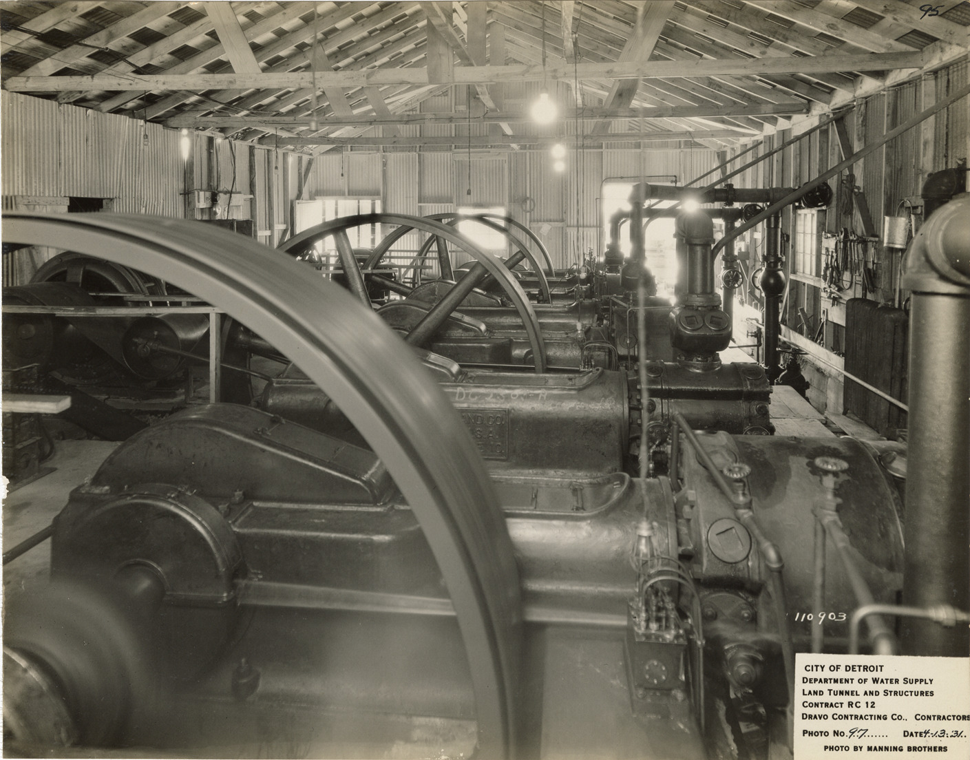 View of the interior of the compressor house, Waterworks Park, Detroit water supply system. Printed on front: "City of Detroit. Department of Water Supply. Land tunnel and structures. Contract RC 12. Dravo Contracting Co., contractors. Photo no. 97. Date: 4-13-31. Photo by Manning Brothers." Typed on back: "View of interior of compressor house."