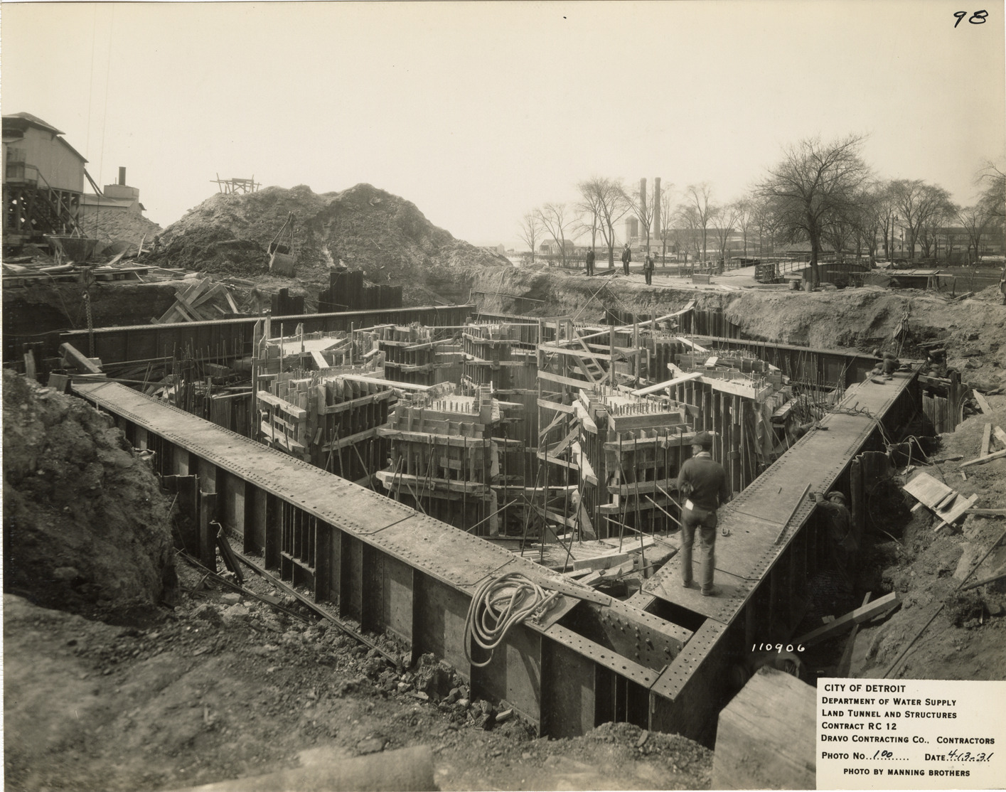 View of screen chamber during construction, Waterworks Park, Detroit water supply system. Man stands on girder in foreground. Printed on front: "City of Detroit. Department of Water Supply. Land tunnel and structures. Contract RC 12. Dravo Contracting Co., contractors. Photo no. 100. Date: 4-13-31. Photo by Manning Brothers." Typed on back: "Screen chamber. Screen piers concreted and girders approximately in final position. View looking to southwest."