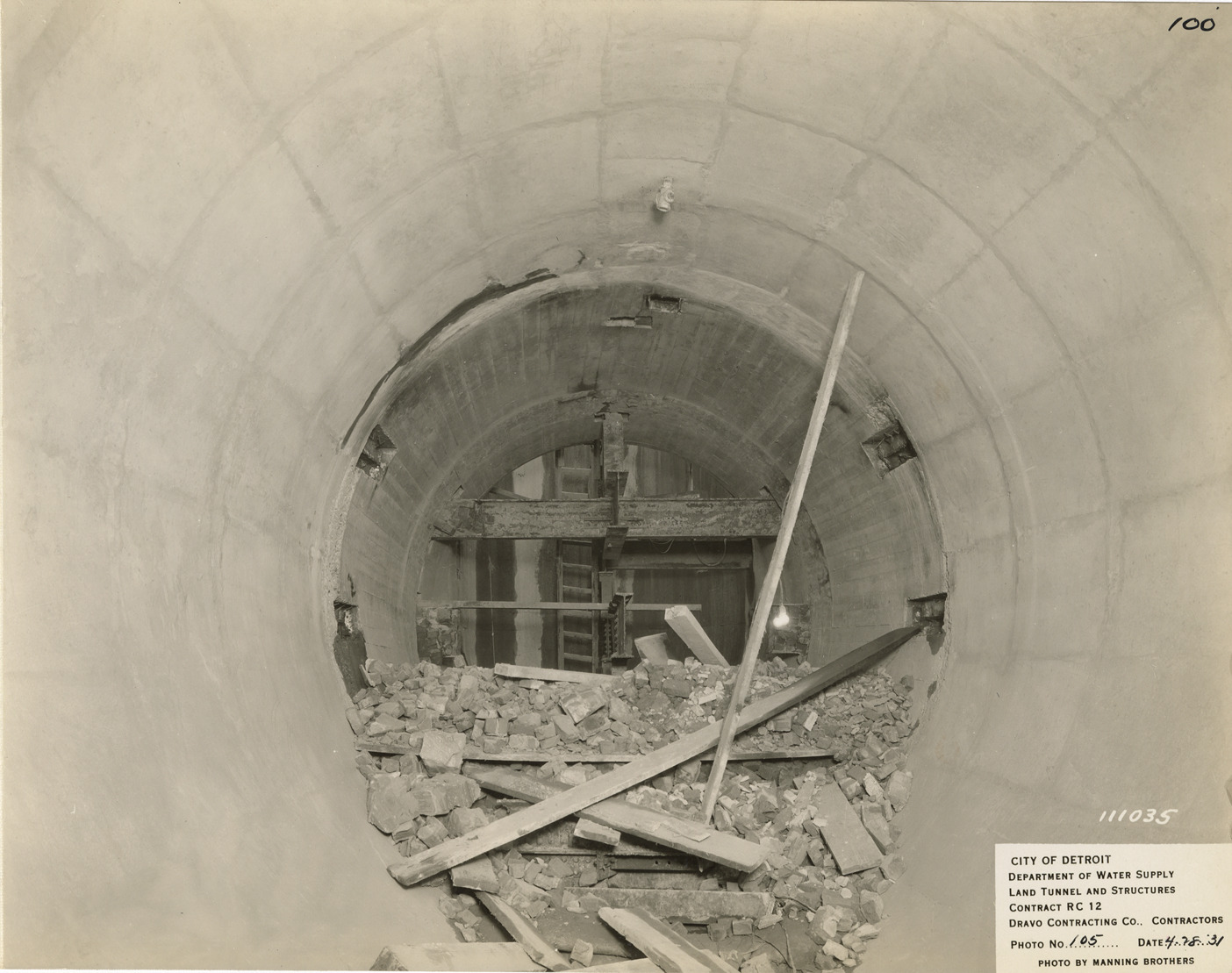 View from tunnel of screen chamber during construction, Waterworks Park, Detroit water supply system. Printed on front: "City of Detroit. Department of Water Supply. Land tunnel and structures. Contract RC 12. Dravo Contracting Co., contractors. Photo no. 105. Date: 4-28-31. Photo by Manning Brothers." Typed on back: "Quarter-bend at screen chamber. View from 14 ft. tunnel. Niches in concrete were formed around struts for support of excavation. Debris is from brick bulkhead."