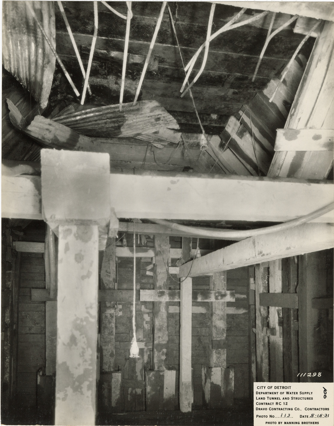 View of tunnel during construction, Waterworks Park, Detroit water supply system. Printed on front: "City of Detroit. Department of Water Supply. Land tunnel and structures. Contract RC 12. Dravo Contracting Co., contractors. Photo no. 113. Date: 5-15-31. Photo by Manning Brothers." Typed on back: "Timber for first drive of 12'-0" tunnel stub at north stop log shaft, Water Works Park."