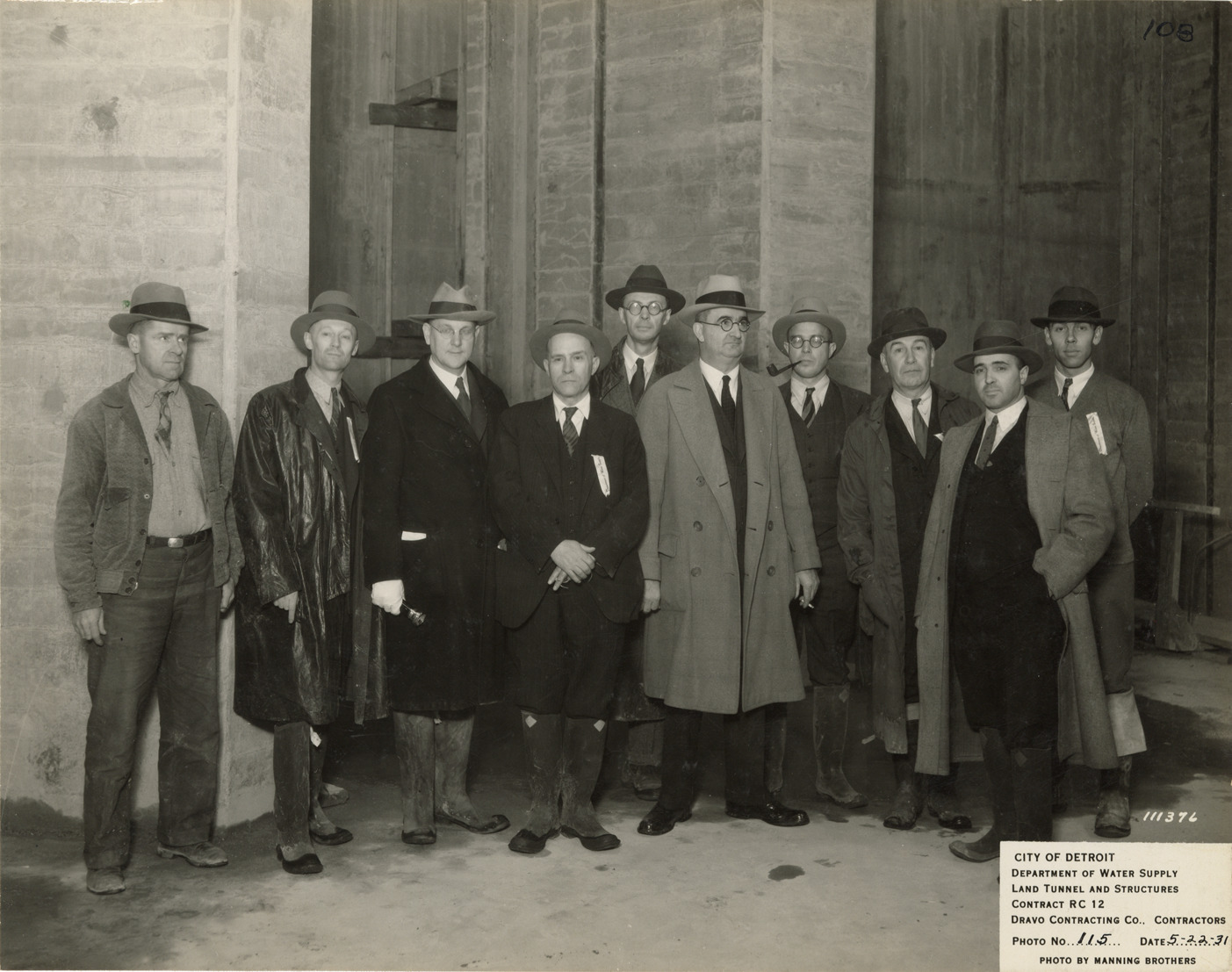 Group portrait of engineers and other municipal employees who accompanied the mayor of Detroit on an inspection tour of the river and land tunnels, Waterworks Park, Detroit water supply system. Printed on front: "City of Detroit. Department of Water Supply. Land tunnel and structures. Contract RC 12. Dravo Contracting Co., contractors. Photo no. 115. Date: 5-22-31. Photo by Manning Brothers." Typed on back: "Part of party accompanying His Honor the Mayor on inspection trip of the river tunnels and the land tunnels in Water Works Park. Picture taken in screen chamber. The parties from left to right are: Romberg, Field Engineer, River Tunnels; E.A. Prokop, Designing Engr., River Tunnels; Clarence E. Wilcox, Corporation Council [sic]; George H. Fenkell, General Manager, Dept. of Water Supply; Torris Eide, Asst. Eng., River Tunnels; Wm. J. Skrzycki, member of Board of Water Commissioners; L.G. Lenhardt, Asst. Engr., Land Tunnels; Harry Gould, Superintendent of Water Works Park Stations; F. Gardner Legg, Sanitary Engineer, Dept. of Health; H.R. Kallgren, Asst. Civil Engineer, River Tunnels."