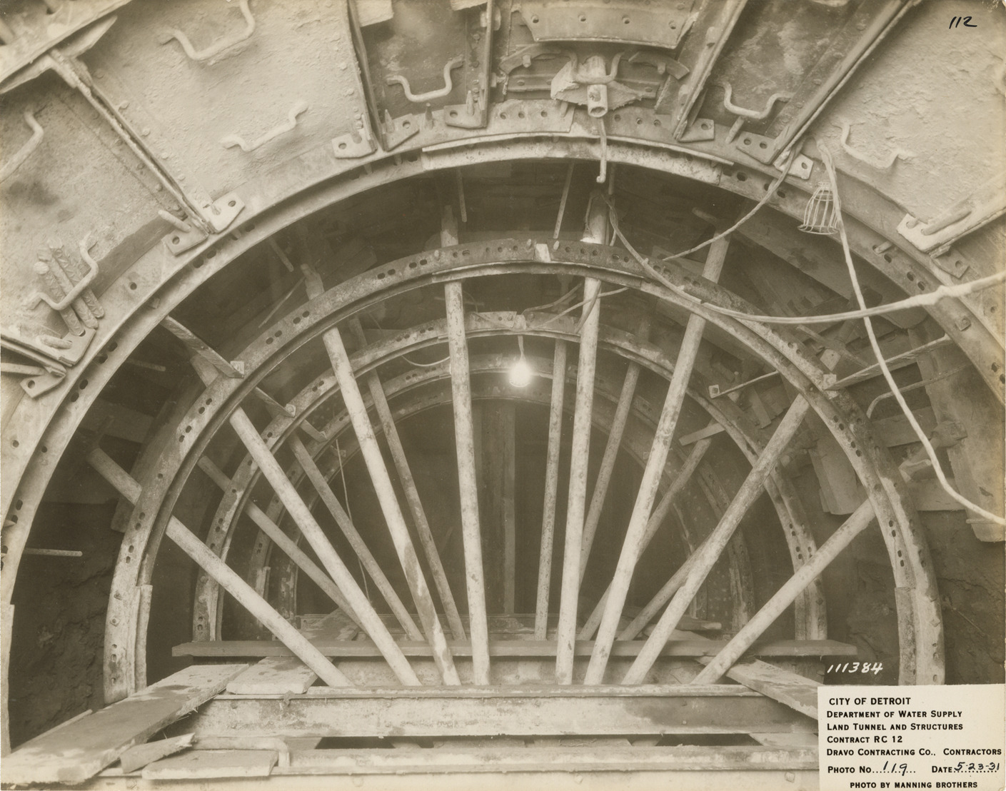 View of tunnel during construction, Waterworks Park, Detroit water supply system. Printed on front: "City of Detroit. Department of Water Supply. Land tunnel and structures. Contract RC 12. Dravo Contracting Co., contractors. Photo no. 119. Date: 5-23-31. Photo by Manning Brothers." Typed on back: "View of last drive, 12 ft. in the 11 ft. tunnel. Bulkhead in bellmouth of auxiliary low lift plant removed."