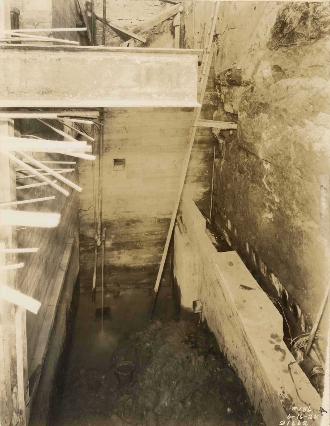View of pump pit no. 3, pumping station no. 1, Waterworks Park, Detroit water supply system. Printed on front: "#186, 6-16-28." Stamped on back: "Manning Bros., commercial photographers. 504-505 Lincoln Building. Corner State and Park Sts., Detroit, Mich." Handwritten on back: "S.W. pump pit #3, Sta. #1, W.W.P. Sta. Work by Water Board labor."