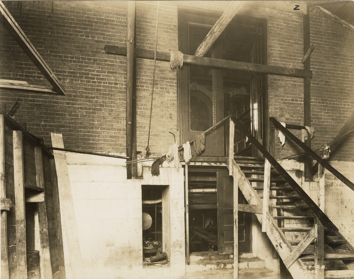 Close-up view of oil storage shed, pumping station no. 2, Waterworks Park, Detroit water supply system. Printed on front: 3-29-28." Stamped on back: "Manning Bros., commercial photographers. 504-505 Lincoln Building. Corner State and Park Sts., Detroit, Mich." Typed on back: "City of Detroit. Department of Water Supply. Division of Engineering. Water Works Park. Pumping station no. 2. Oil storage shed. View of portion of south wall, showing doorways to pumping station no. 2."